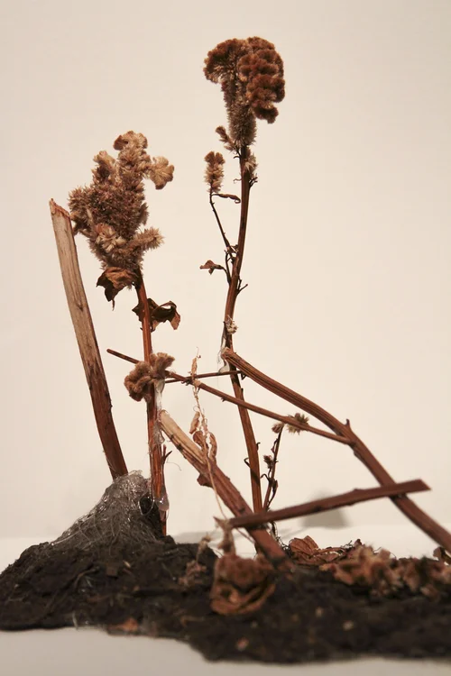 Aubrey Manson, We Are Growing Old, 2012. Dried flowers, dirt, hot glue, 11”x14”x9”